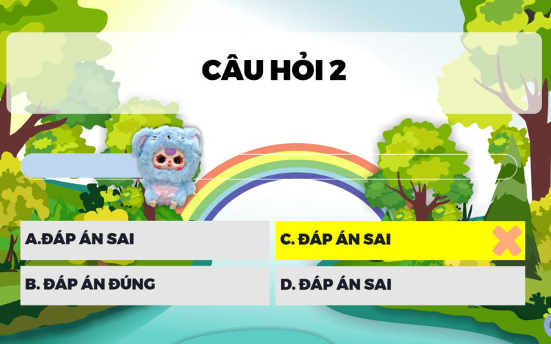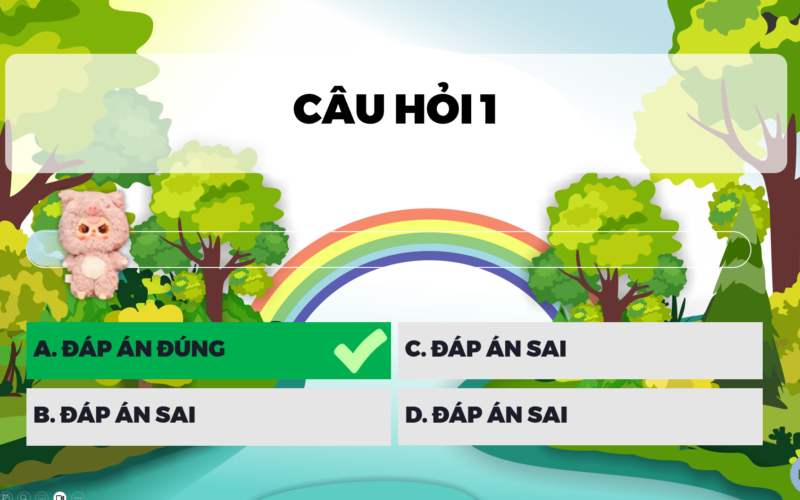 Điểm cuốn hút của trò chơi nằm ở cách thiết kế trực quan, vui nhộn và cực kỳ bắt mắt. Mỗi lượt chơi đều tạo sự hồi hộp, mong chờ; mỗi câu hỏi hiện ra rõ ràng, sinh động; đáp án đúng – sai được phản hồi trực tiếp bằng hiệu ứng nổi bật, giúp tiết học không còn khô khan mà trở nên sôi nổi, cuốn hút hơn rất nhiều. Đây là dạng game rất phù hợp để thầy cô sử dụng trong phần khởi động, luyện tập, củng cố kiến thức, ôn tập cuối bài hoặc tổ chức thi đua giữa các nhóm.
