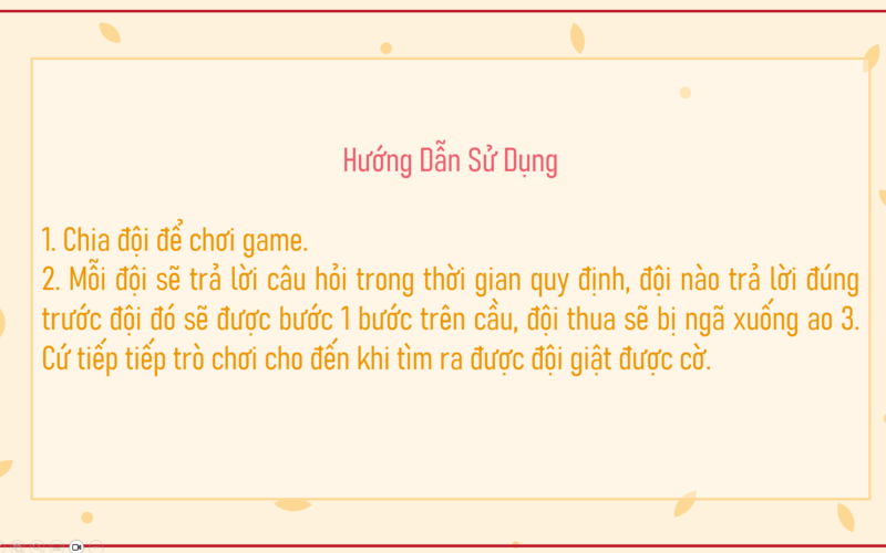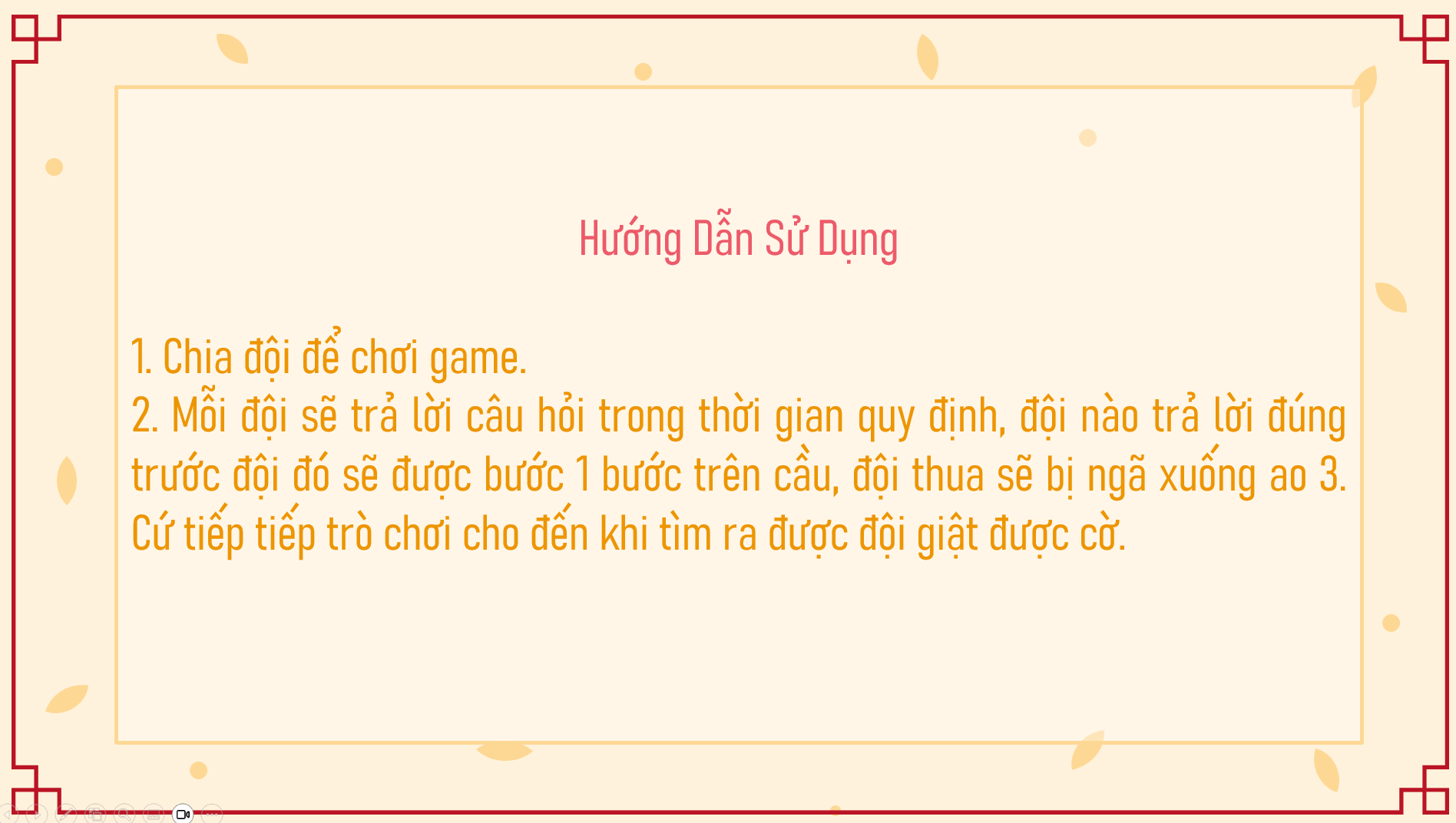 2. Mỗi đội sẽ trả lời câu hỏi trong thời gian quy định, đội nào trả lời đúng trước đội đó sẽ được bước 1 bước trên cầu, đội thua sẽ bị ngã xuống ao 3. Cứ tiếp tiếp trò chơi cho đến khi tìm ra được đội giật được cờ.